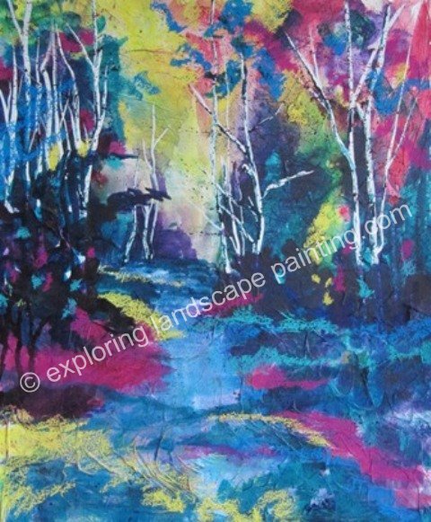Silver BirchA colourful painting showing the striking trunks of silver birch trees.